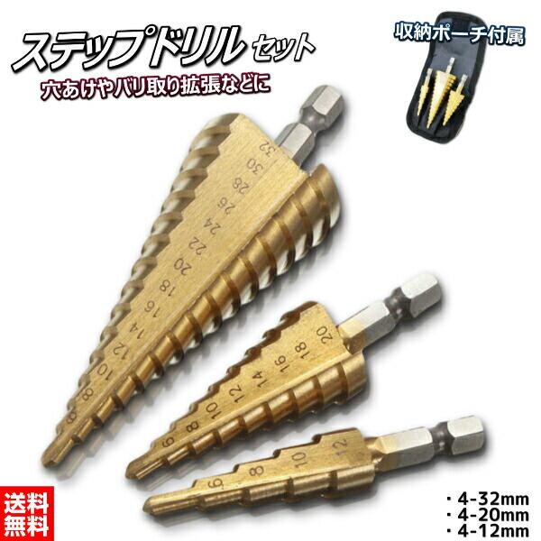 ステップドリル 3本セット チタンコーティング タケノコドリル 六角 収納ケース付き 送料無料 六角軸