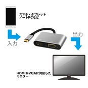 USB-Cポートを搭載した機器に接続することにより、テレビやモニターやプロジェクターにHDMIとVGAで映像を同時に出力を可能とするマルチ変換アダプターです。