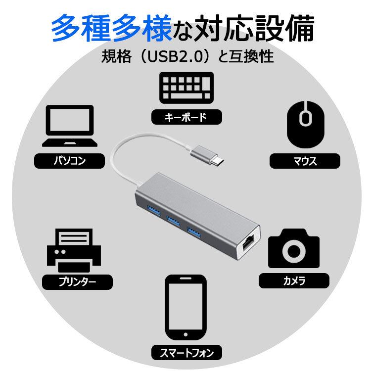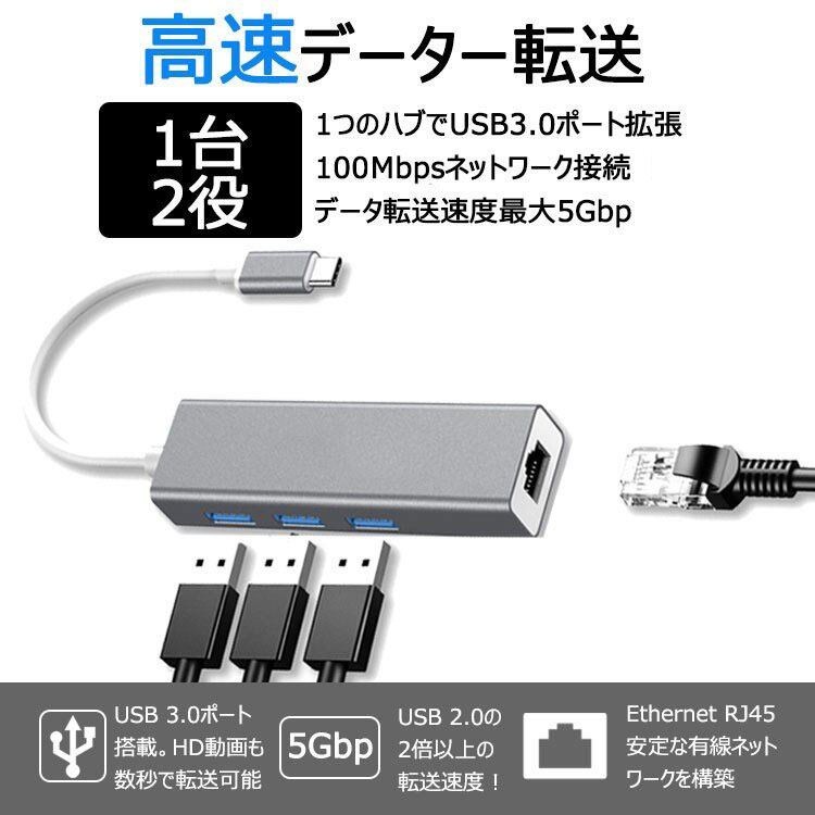 USBハブ USB3.0 充電 Type-C タイプC 3ポート LANポート 有線LANアダプター 高速 軽量 データ転送