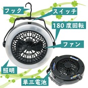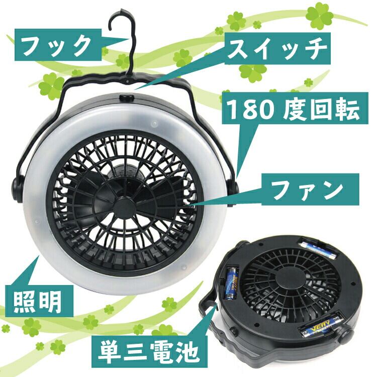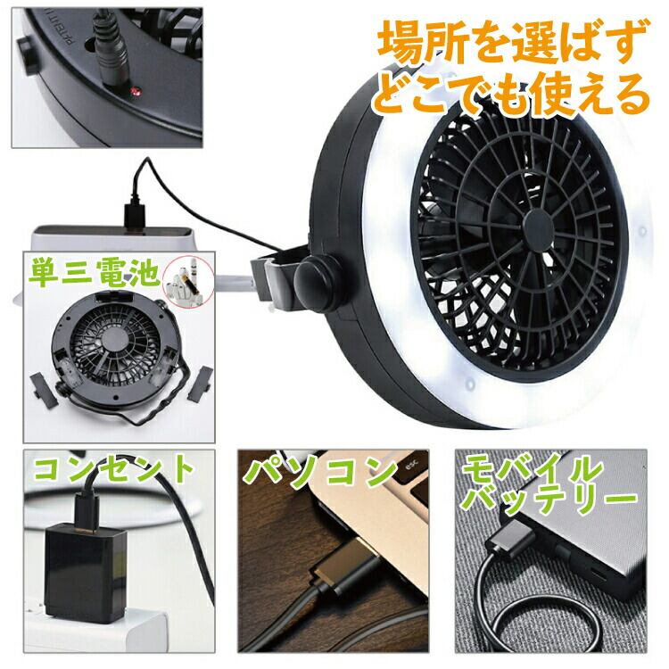 扇風機 LED ランタン ライト ファン USB 電池 式 2way アウトドア 吊り下げ 静音 テント キャンプ 卓上 携帯 持ち運び 車内 車中泊 フック 角度調整 屋外 室内