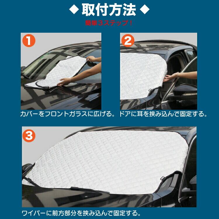 フロントガラスへサッと被せ、両端をドアに挟み込みワイパーで固定するタイプとなり