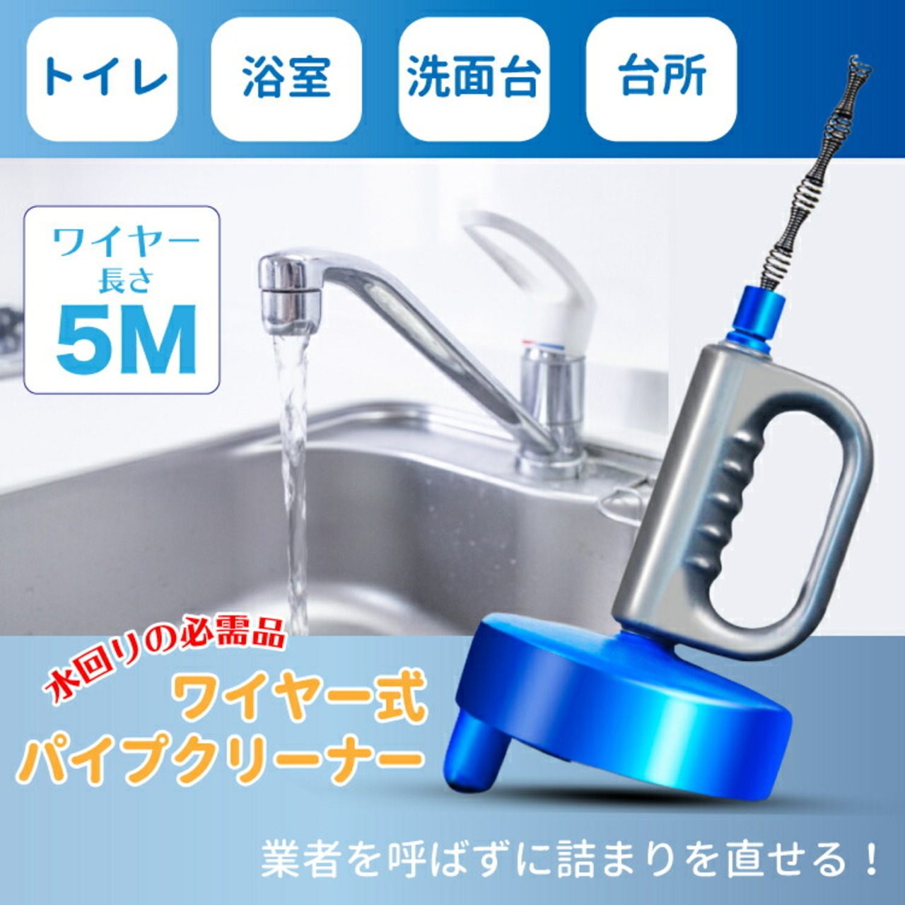パイプクリーナー ワイヤー ブラシ 回転式 5m 排水口 詰まり解消 つまり クリーナー 洗面所 トイレ お風呂 キッチン 水回り 修理 強力 大掃除 掃除 便利