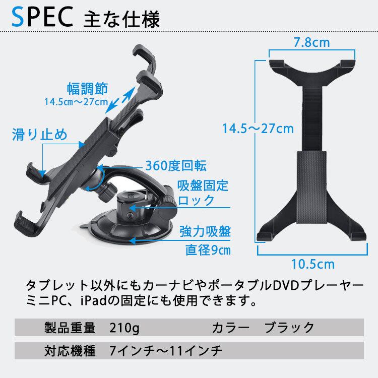 タブレットホルダー 車載 車 吸盤 タブレットスタンド 360度回転 卓上 角度調整 7インチ 11インチ 真空吸盤