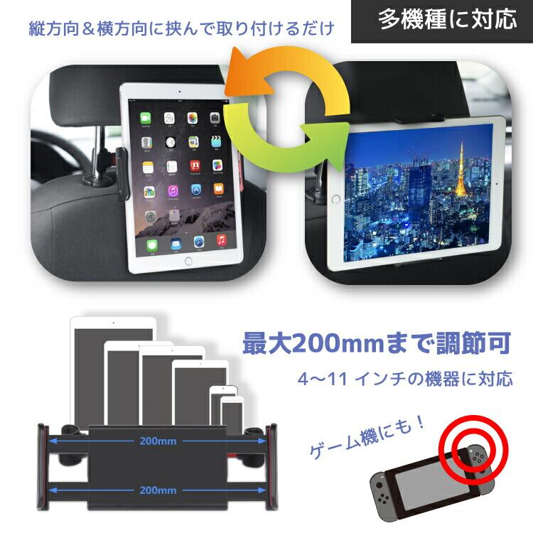 タブレットホルダー 車 スマホホルダー 後部座席 真ん中 車載 後席 ヘッドレスト ホルダー 中央 伸縮 伸びる アーム iPad iphone 任天堂スイッチ Android 対応