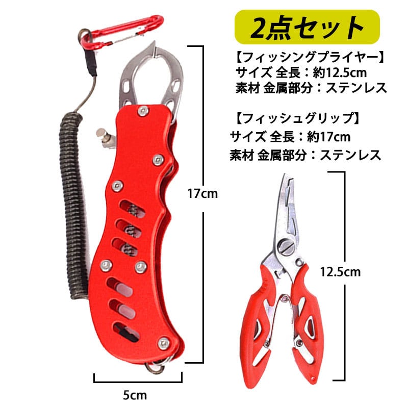 フィッシュグリップ セット 赤 ホルダー フィッシュプライヤー 2点 セット フィッシュ 多機能 軽量 釣具 防錆 安全ストラップ付 魚掴み アルミ ステンレス